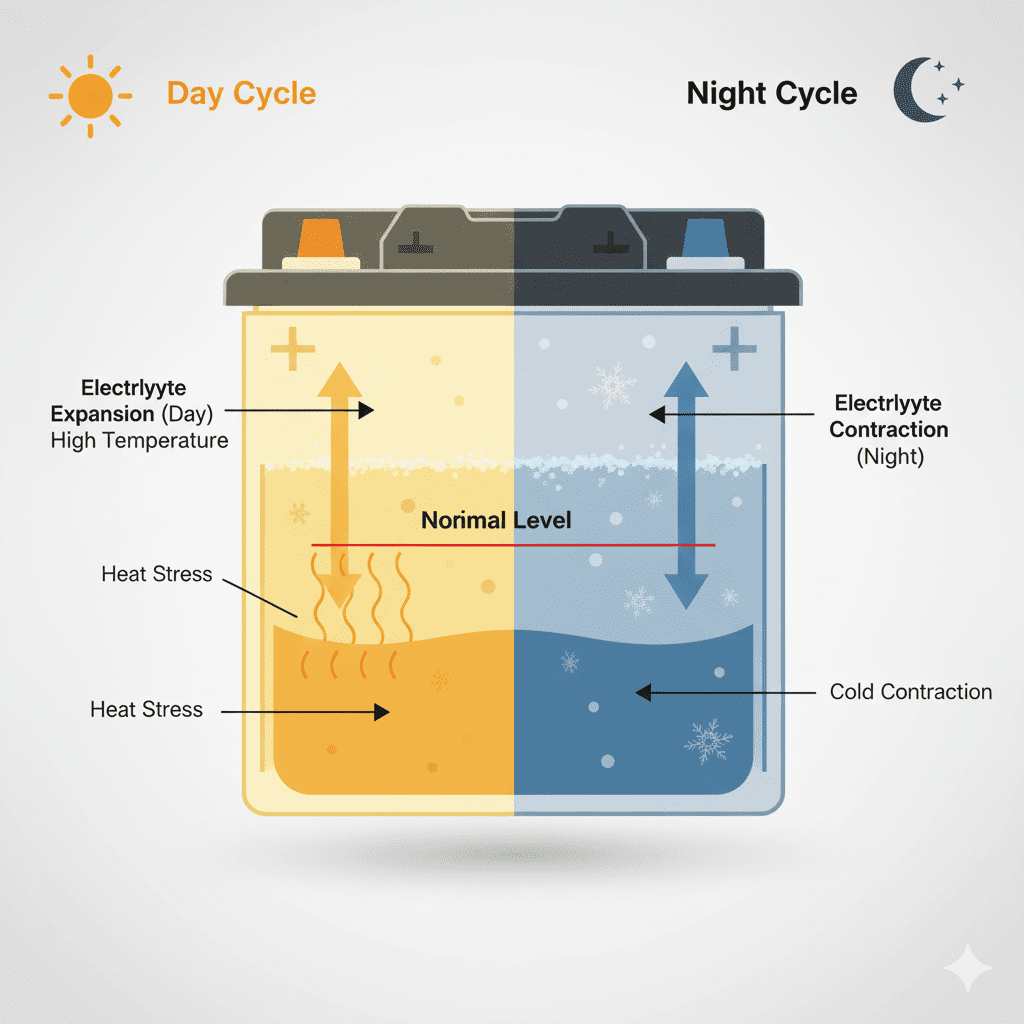 Night–day temperature swings cause electrolyte expansion during hot daytime and contraction at night, creating internal stress. This stress speeds up chemical wear, increases resistance, and reduces overall battery cell efficiency.